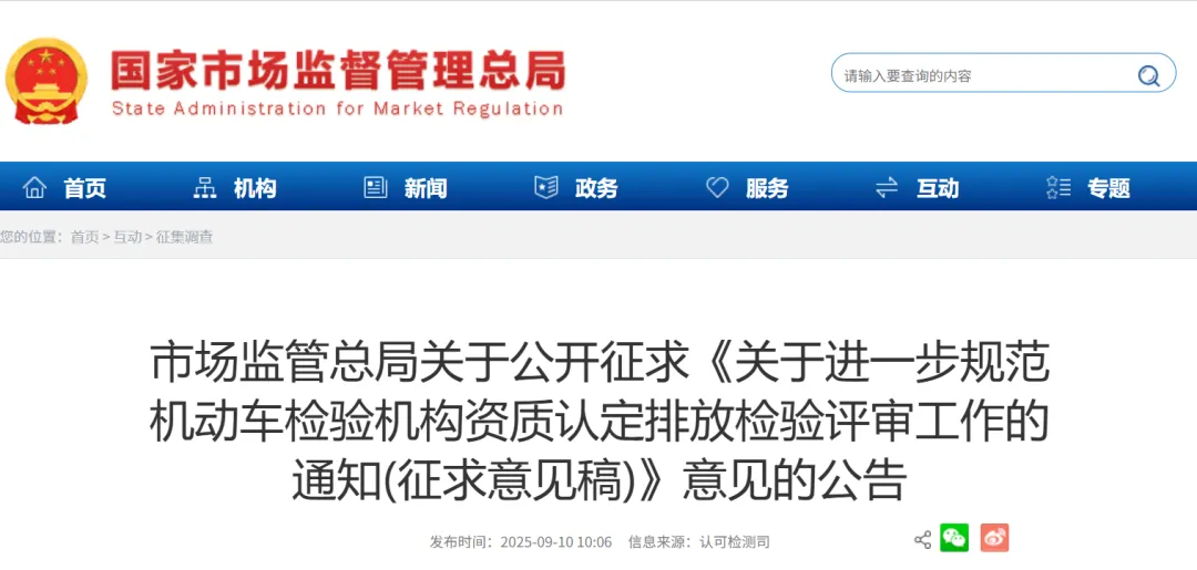 市场监管总局就《关于进一步规范机动车检验机构资质认定排放检验评审工作的通知(征求意见稿)》公开征求意见