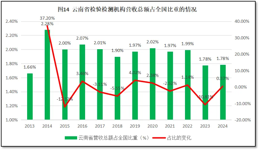 由图14可见,云南省检验检测机构营收总额在全国检验检测行业营收总额中的比重在2014年达到2.28%的高点后就逐步下降到2%左右,总体来看变动不大,呈现轻微波动的发展特点,2023年降到1.78%,2024年仍保持在1.78%。从增长率曲线来看,从2015年起,云南省检验检测机构营收总额占比的增长率总体逐步走低,11年来的年均增幅为-2.27%,说明云南省检验检测机构在全行业里的地位有所下降。