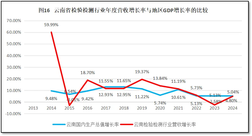 从图15可见,除了2014年之外,过去10年云南省检验检测机构营收总额在当地GDP中的占比增长不大,2021-2022年占比达到0.3%的高点后,2023年又下降到了0.28%,2024年维持在8%。除了2014年之外,云南省的数值一直比全国平均数要低,且近几年还有被全国平均数拉开差距的迹象。这说明云南省检验检测机构在云南省经济版图中的地位不高,其创造的价值与云南省的经济总量相比还很微小,最近几年这种情况还有所恶化。