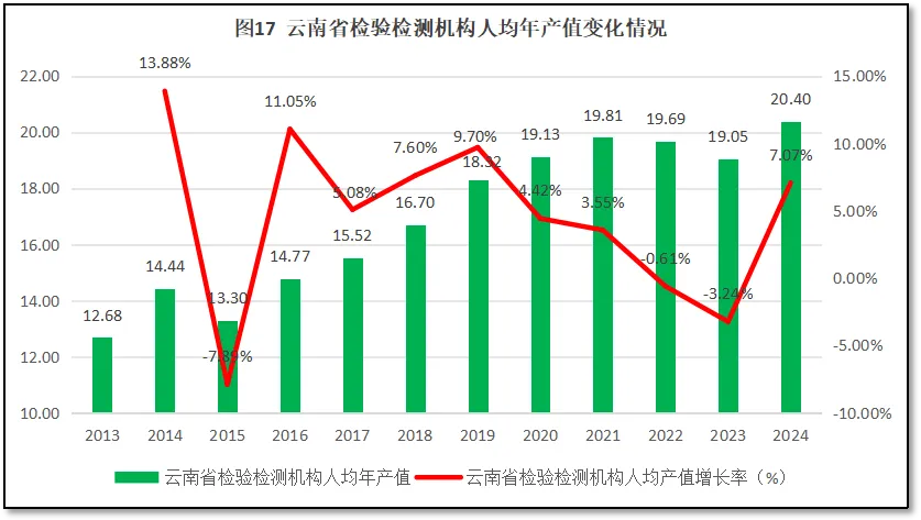 由图17可见,2021年之前,云南省检验检测机构人均年产值总体保持增长,从2013年的12.68万元,逐步增长到2021年19.81万元的峰值,在此之后开始下降。到2023年下降到19.05万元。2024年,云南省检验检测机构人均年产值出现一定反弹,首次超过20万元,达到20.40万元。从增长率来看,在2019年之前,云南省检验检测机构人均年产值增幅波动较大,在2016年和2019年先后出现两次较高的涨幅之后,开始进入下降区间。到2022年之后连续两年增长率是负值,2024年止跌回升,增长率为7.07%。