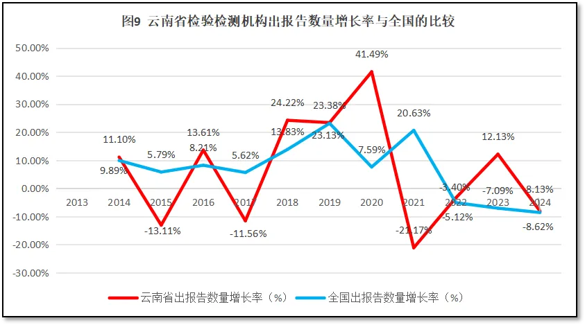 云南省检验检测机构出具报告数量的增长率与全国检验检测机构出具报告增长率的比较,如图9所示。