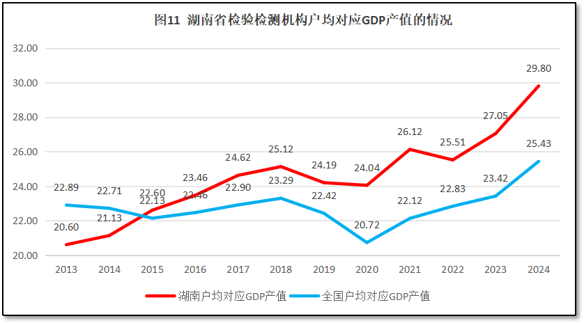 湖南省2024年度地区生产总值(GDP值)53231亿元,全国排名第10位(较2023年度下降了1位)。湖南省1786家检验检测机构,户均对应的GDP值为29.8亿元,比全国平均水平的25.43亿元高出4.37亿元,排名全国第9位(从高到低排序),处于相对靠前的位置,且与2023年度排名持平。过去12年湖南省检验检测机构户均对应的GDP值与全国的情况比较,如图11所示。