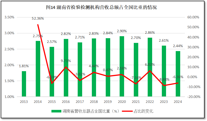 2024年度,湖南省检验检测机构营收总额为118.96亿元,占全国检验检测行业年度营业收入的2.44%,在全国检验检测行业中排名第14,与2023年度排名持平。过去12年湖南省检验检测行业年度营业收入总额在全行业中的占比情况,如图14所示。