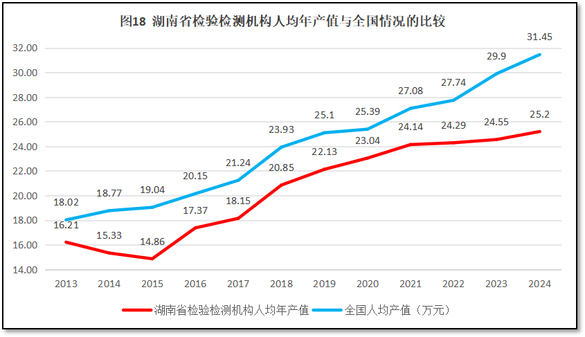湖南省检验检测机构人均年产值与全国的情况比较,如图18所示。